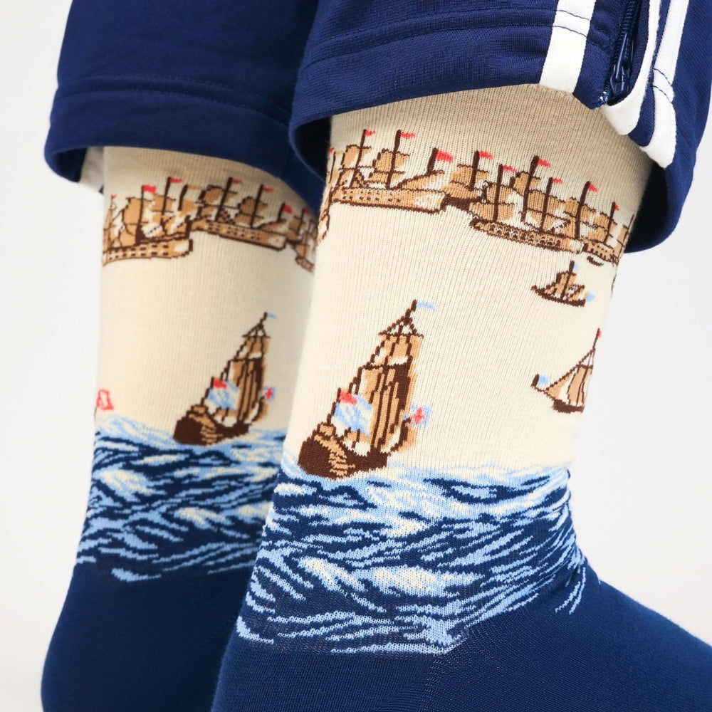 Willem van de Velde de Oude was geen gewone kunstenaar – hij was een echte 'embedded journalist' die vanaf een Nederlands schip de Slag bij Solebay vastlegde. Zijn schetsen transformeerde hij later tot ontwerpen voor monumentale wandtapijten, gecommissioneerd door Koning Charles II. Elk detail op deze sokken – van rode vlaggetjes tot karakteristieke golven – is gebaseerd op die eeuwenoude koninklijke opdracht.