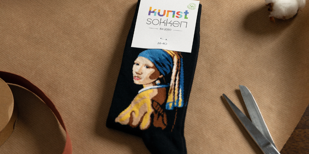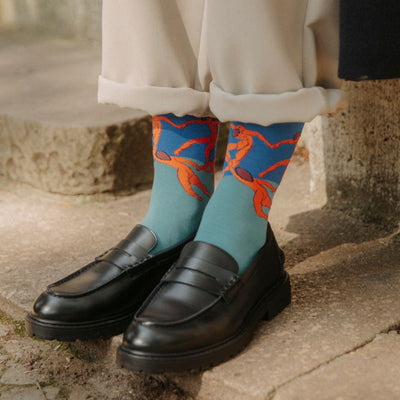 De Kus sokken geïnspireerd op Gustav Klimt's meesterwerk, gemaakt van biologisch katoen.De Kus