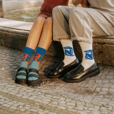Delfts Blauw Bloemen sokken geïnspireerd op Nederlands porselein, gemaakt van biologisch katoen.Twee mensen dragen de Delfts Blauw Bloemen sokken geïnspireerd op de klassieke ontwerpen van Delfts aardewerk.
