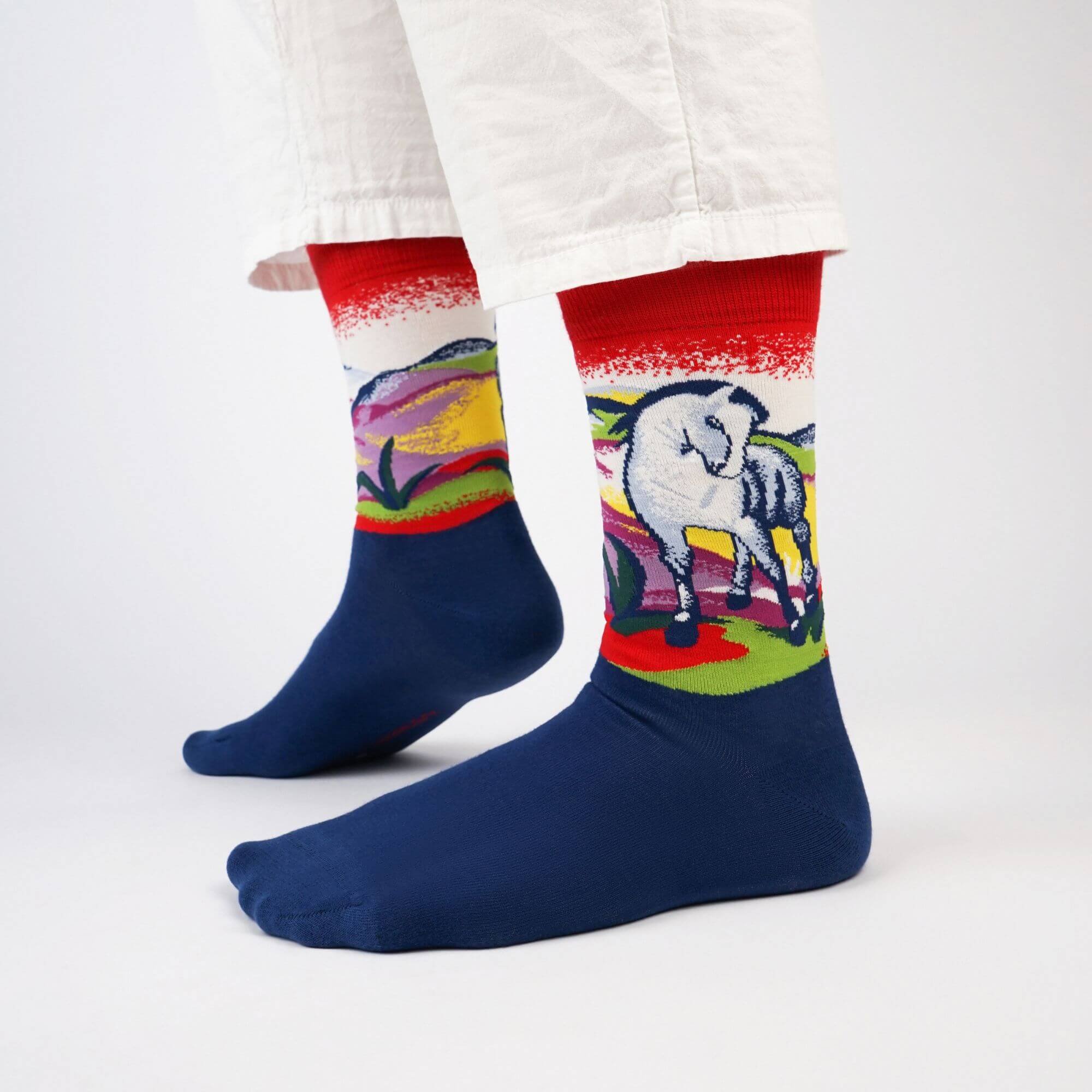 De kunstwerken op onze sokken zijn niet geprint, maar echt ingeweven – iets wat veel mensen verrast. Omdat de kleuren in de stof zijn verweven, blijven ze was na was helder en levendig. Zelfs na tientallen keren dragen zien je sokken er nog steeds stralend uit, alsof ze net uit de verpakking komen. Zo geniet je extra lang van kunst aan je voeten!