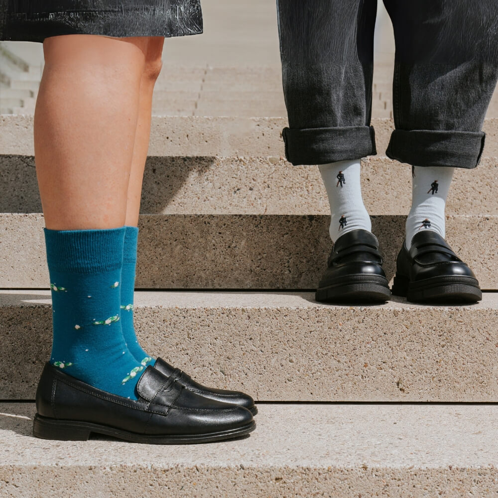 De kunstwerken op onze sokken zijn niet geprint, maar echt ingeweven – iets wat veel mensen verrast. Omdat de kleuren in de stof zijn verweven, blijven ze was na was helder en levendig. Zelfs na tientallen keren dragen zien je sokken er nog steeds stralend uit, alsof ze net uit de verpakking komen. Zo geniet je extra lang van kunst aan je voeten!