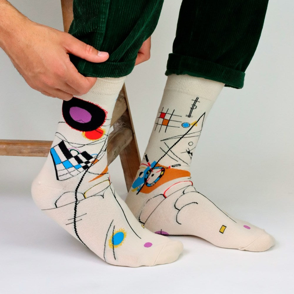 De kunstwerken op onze sokken zijn niet geprint, maar echt ingeweven – iets wat veel mensen verrast. Omdat de kleuren in de stof zijn verweven, blijven ze was na was helder en levendig. Zelfs na tientallen keren dragen zien je sokken er nog steeds stralend uit, alsof ze net uit de verpakking komen. Zo geniet je extra lang van kunst aan je voeten!